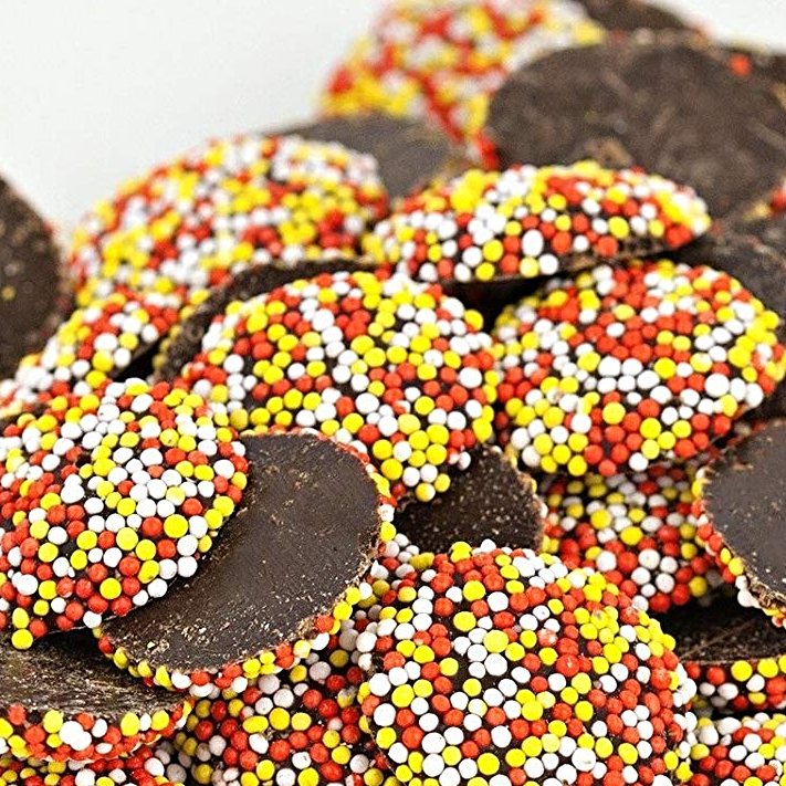 Decadent dark chocolate with autumn colored candy nonpareils.