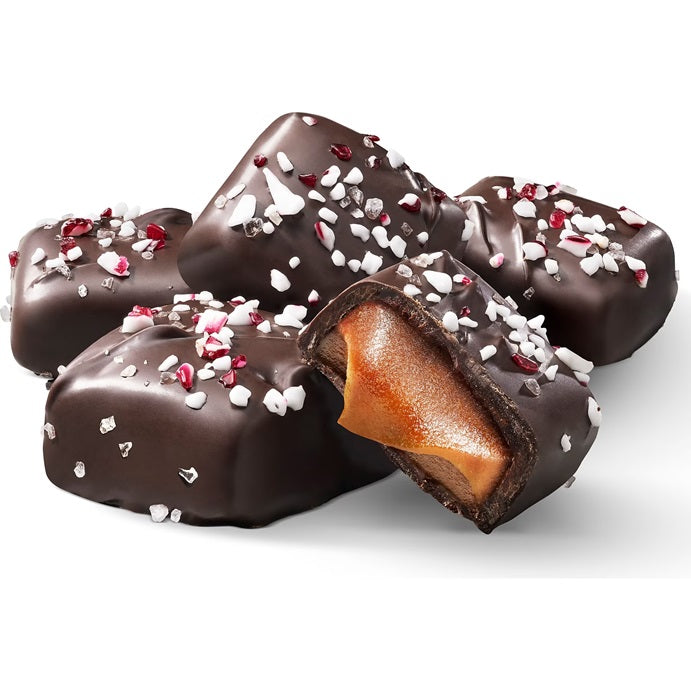 - Kettle-cooked caramel in a seasonal-exclusive Peppermint flavor draped in premium dark chocolate and sprinkled with coarse sea salt